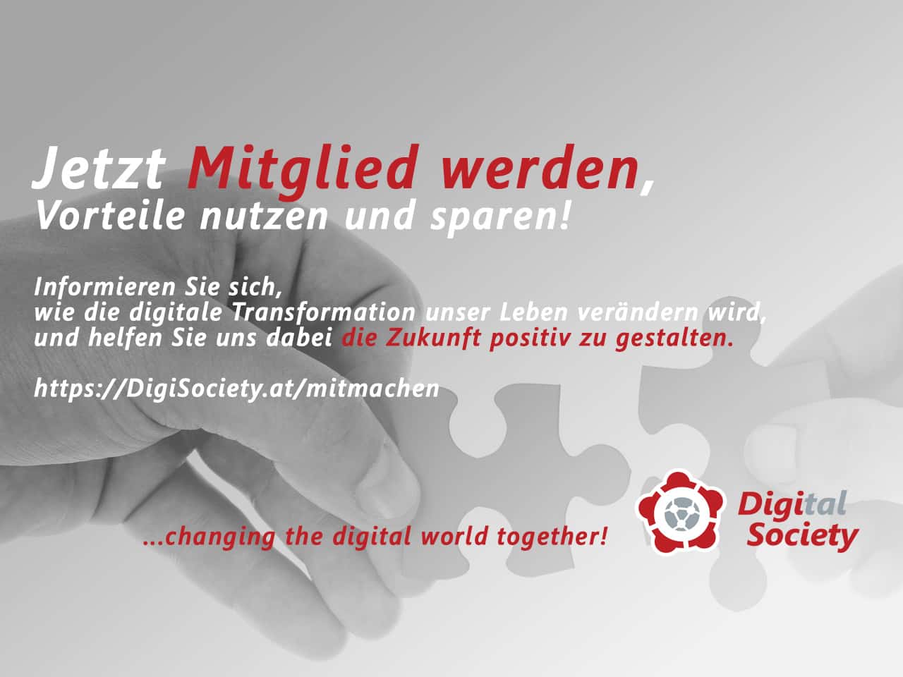 Jetzt Mitglied werden und sparen. Die Digital Society hat es sich als unabhängiger und gemeinnütziger Verein zum Ziel gesetzt, Sie bei der positiven Nutzung und Gestaltung der digitalen Transformation zu begleiten und zu unterstützen. Einer der wichtigsten Aspekte dabei ist die Veränderung der Arbeitswelt. Diesen Schwerpunkt haben wir uns für das Vereinsjahr 2020 gesetzt.