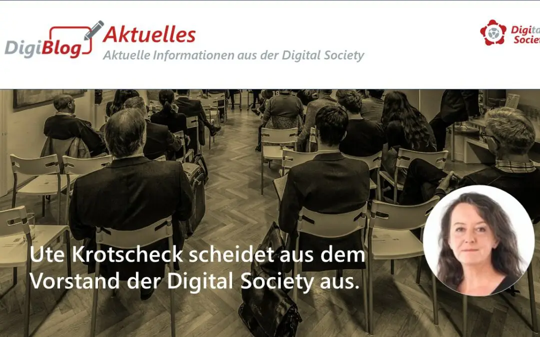 Ute Krotscheck hat uns in der gestrigen Vorstandssitzung mitgeteilt, dass Sie aus persönlichen Gründen leider bis auf weiteres Ihre Vorstandsfunktion nicht ausüben kann. Sie unterstützt die Digital Society gerne weiterhin ehrenamtlich in administrativen Tätigkeiten....